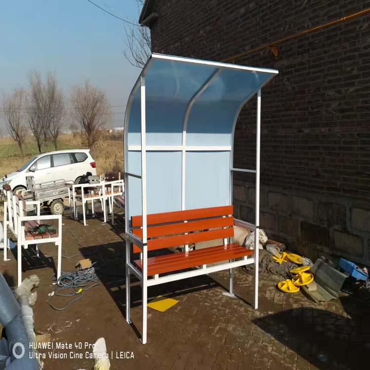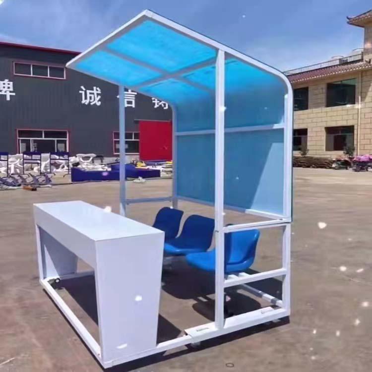 材质:底座为5*5厘米镀锌钢管,顶棚为不锈钢钢管(普通的为钢管)棚顶采用耐力板或者(阳光板)。采用中空吹塑座椅。底座有移动轮,可移动,移动轮可收纳,底部有防风加强支撑架,保证防护棚的稳定性