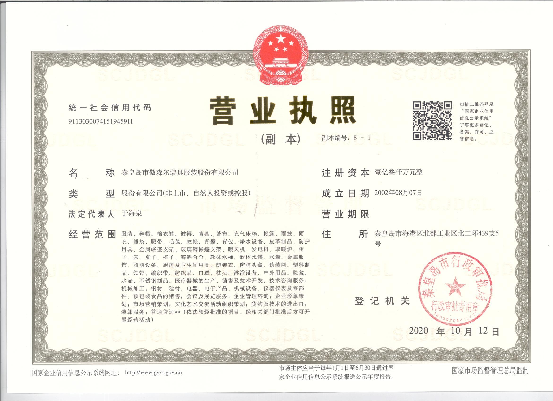 秦皇岛市傲森尔装具服装股份有限公司