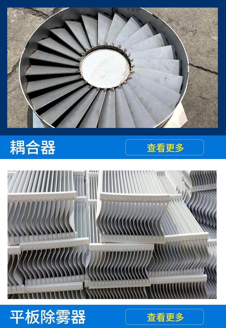 公司主要产品:燃煤电站和工业燃烧系统吸收塔内除雾器(由屋脊式、平板式、管式、水平烟道式,不锈钢,管束,涡流耦合等多种形式除雾器)、节能增效装置、合金滤网、氧化空气管、烟道贴衬、事故喷淋管及塔内外合金零部件的设计、制造和指导安装、调试等。其中平板式、屋脊式、管式、水平烟道式等除雾器及节能增效装置等获得七项国家实用新型专利,是国家除雾器设备行业标准起草单位。