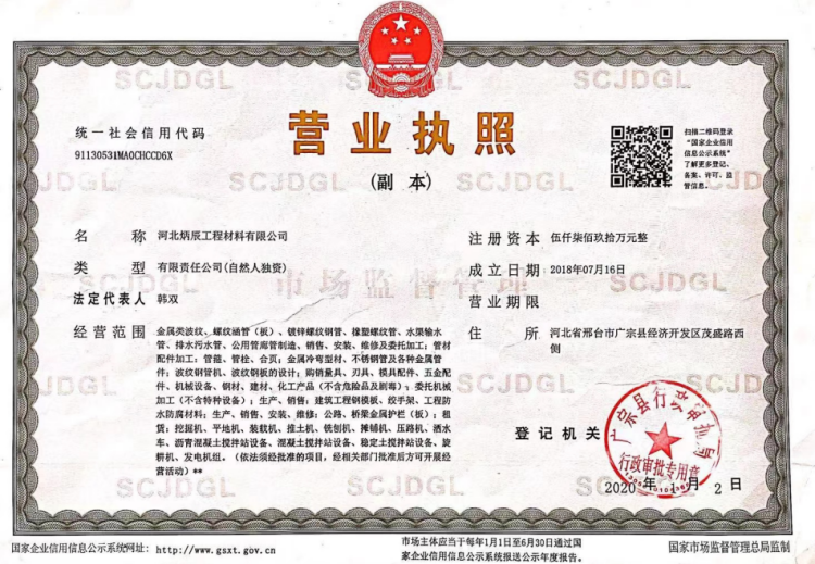 河北炳辰工程材料有限公司成立于2018-07-16,法定代表人为韩双,注册资本为5790万元人民币,统一社会信用代码为91130531MA0CHCCD6X,企业地址位于河北省邢台市广宗县经济开发区茂盛路西侧,所属行业为金属制品业,经营范围包含:金属类波纹、螺纹涵管(板)、镀锌螺纹钢管、橡塑螺纹管、水渠输水管、排水污水管、公用管廊管制造、销售、安装、维修及委托加工;管材配件加工:管箍、管栓、合页;金属冷弯型材、不锈钢管及各种金属管件;波纹钢管机、波纹钢板的设计;购销量具、刃具、模具配件、五金配件、机械设备、钢材、建材、化工产品(不含危险品及剧毒);委托机械加工(不含特种设备);生产、销售:建筑工 ...