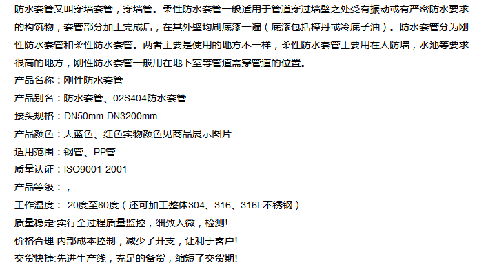 | 产品名称 | 柔性防水套管 | 材 质 | 碳钢、SUS201、SUS304 |