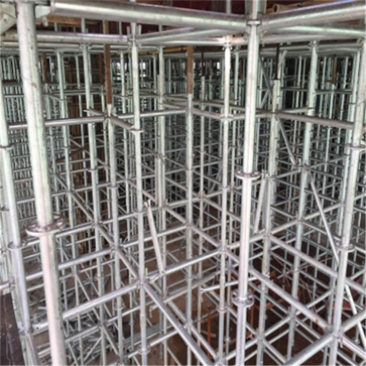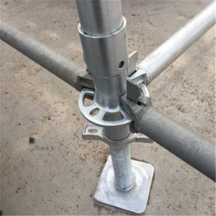 盘扣式脚手架又称菊花盘式脚手架系统,插盘式脚手架系统,轮盘式脚手架系统,扣盘式脚手架,layher架,也被业内人士称为“雷亚架”。主要用于大型演唱会的灯光架、背景架。 圆盘式多功能脚手架,是继碗扣式脚手架之后的升级换代产品。这种脚手架的插座为直径133mm、厚10mm的圆盘,圆盘上开设8个孔,采用φ48*3.5mm、Q345B钢管做主构件,立杆是在一定长度的钢管上每隔0.60m焊接上一个圆盘,用这种新颖、美观的圆盘连接横杆,底部带连接套。横杆是在钢管两端焊接上带插销的插头制成。