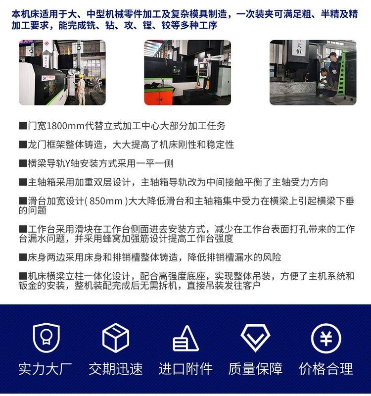 1、 DH2752/2*160数控定梁双龙门移动式镗铣床是集机、电、液等先进技术于一体的机械加工设备,适用于机械、钢铁、能源、汽车、航空航天、兵器、船舶等行业的大、中型零件的加工,特别适用于零件本身重量大,工件长度较长的。机床能在一次装夹过程中高效、高精度的完成黑色金属和有色金属的各种平面、曲面、空间曲面和孔的数控加工。