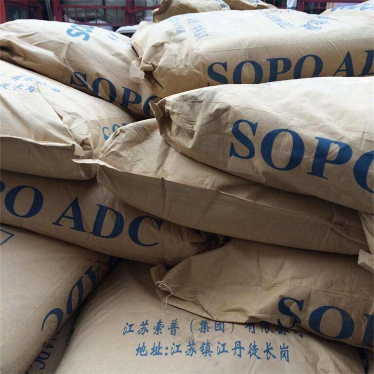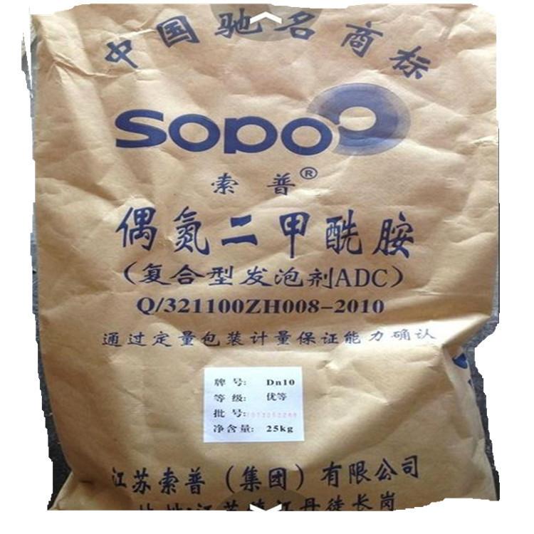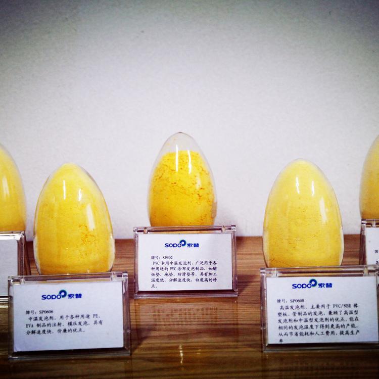AC发泡剂(偶氮二甲酰胺)外观:淡黄色粉末性质:本品无毒,无臭,无污染,在常温下可以贮存,不易变质,不易结块,本品为有机热分解型强力发泡剂,分解温程短。分解生成N2、CO、CO2。用途:制造多种泡塑料的发泡剂,适用于PVC、EVA、PE、PP、PS及各种橡胶的发泡,特别适用于在仿人皮造革及型材制品中,瑜伽垫使用该品所得制品弹性好,泡孔均匀、强度好。产品规格:(1)质量标准(国家标准)指标指标优等品一等品合格品发气量(ML/G)细度筛余物(筛孔38UM)%≤平均粒径(DN)UM≤10分解温度≥200200-210加热减量%≤0.150.250.30灰分%≤0.100.100.20纯度(ADC)%>97095.095.0平均粒度DN系列标准:平均粒度(DN),UM8-1012-1520-22分解温度(℃)190-210发气量(ML/G)210-235水分(%)≤0.2PH值6.5-7.5溶解度一般不溶解所有溶剂灰分(%)≤2.5
