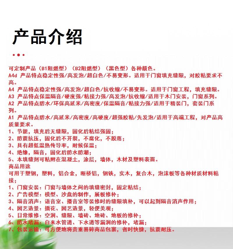 A3 产品特点保温隔音/硬度强/粘接力强/高发泡/抗收缩/适用于木门安装,门窗系列。
