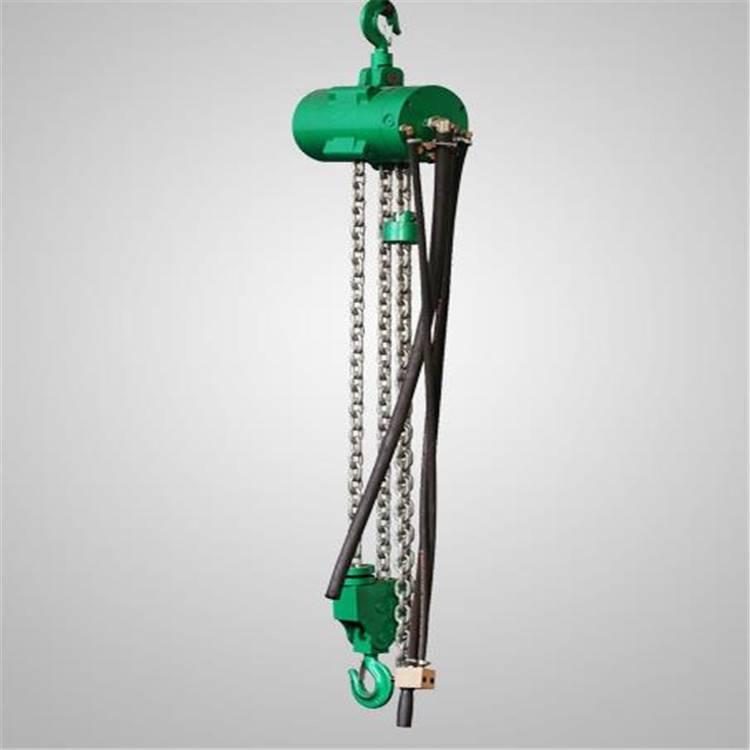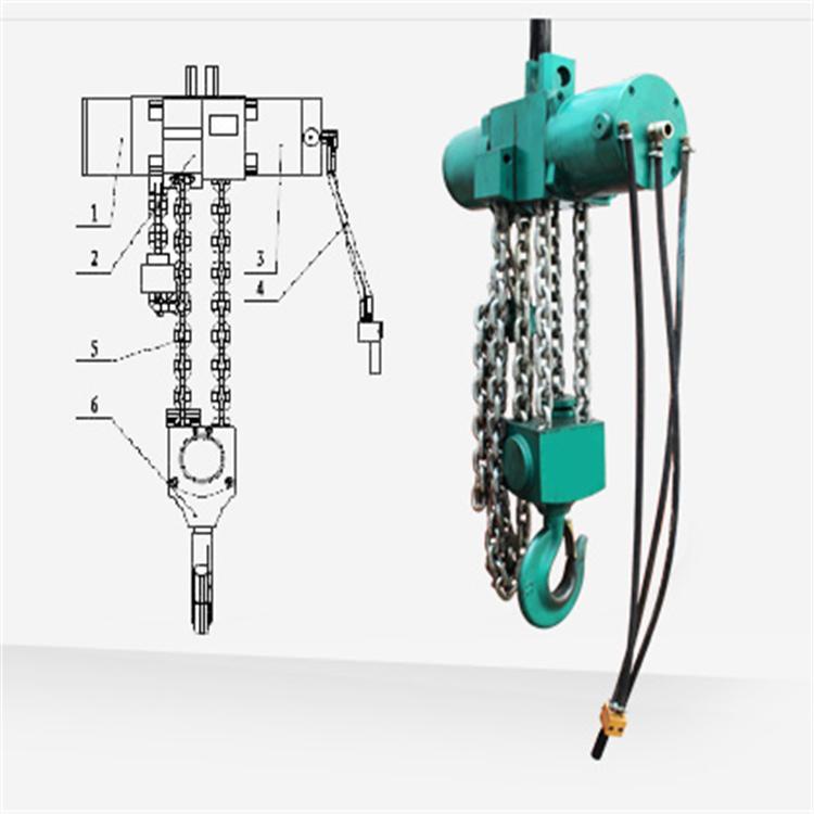 特别说明:我公司生产的气动葫芦从起重量10吨——30吨均为双链条,50吨是4条链,与国外的进口气动葫芦保持同步,产品部分材料是进口的。而有些厂家技术落后生产水平低,加之所用材料制约,不具备制造10吨以上的能力,只能生产3吨或5吨小型气动葫芦,采取在小吨位气动葫芦配上4条链、6条链甚至更多条链组来充当大吨位的气动葫芦,使用时过多的链条经常缠绕一起出现滚链、跳链或链条起升、下降每条链不同步,大大降低工作效率,导至无法工作。如链条组受力不均时单条链有拉断的可能,存在重大安全隐患。