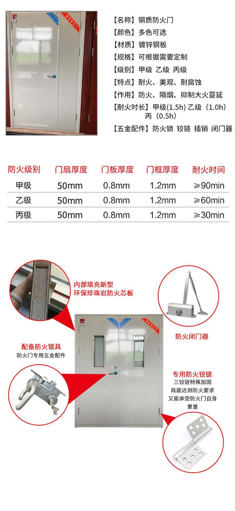 钢质防火门是指用钢质材料制作门框、门扇骨架和门扇面板,并配以防火五金配件所组成的具有一是指定耐火性能的门,防火隔热可达到甲级、乙级。