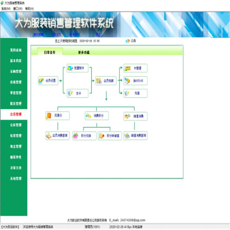 “大为服装销售管理系统”是 由嘉讯电子科技有限公司研究开发出来的面向中小型连锁服装批发、零售企业的管理系统。该系统采用当前业界最先进和最成熟的技术,包含了大量现代服装批发、零售企业的专业功能,能从根本上满足服装批发、零售企业的管理高效、分析精确、降低成本的要求。“大为服装销售管理系统”集批发、零售、结算管理、会员管理、报表管理于一体,能实现有序高效的信息化管理并能适应多种经营方式,为企业提高自身竞争 能力奠定了坚实的基础。 “大为服装销售管理系统”分为前台收银系统及后台管理系统。 前台收银系统主要是实现前台的开单及收银管理;主要功能包括:扫码零售功能,同时具备与后台系统的数据共享,为后台提供各种原始数据。后台管理系统是对前台原始数据的加工与处理。主要功能包括:商品档案管理、批发管理、采购管理会员管理、仓库管理、报表分析、系统设置等。 本产品的适用范围主要包括:服装批发、零售