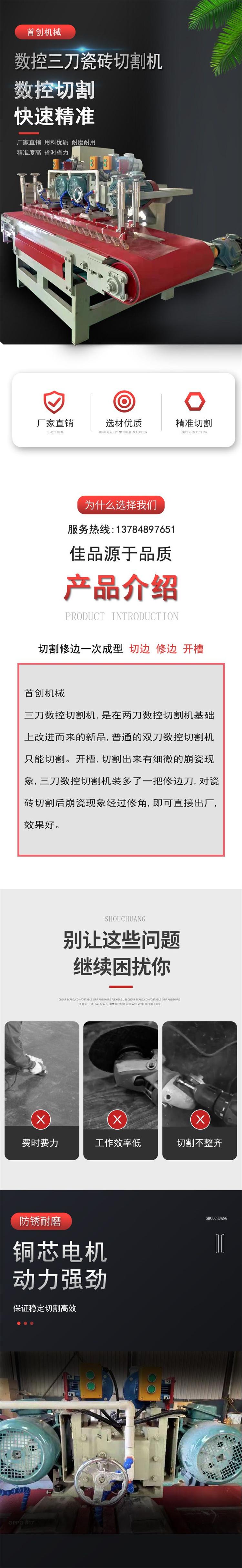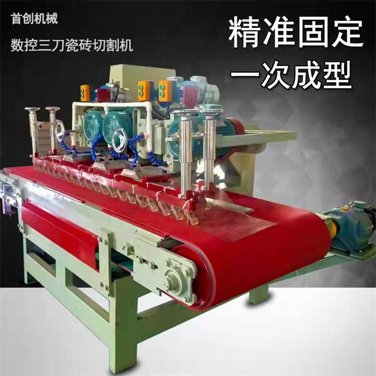 三刀数控切割机,是在两刀数控切割机基础上改进而来的新品,普通的双刀数控切割机只能切割。开槽,切割出来有细微的崩瓷现象,三刀数控切割机装多了一把修边刀,对瓷砖切割后崩瓷现象经过修角,即可直接出厂,效果好。