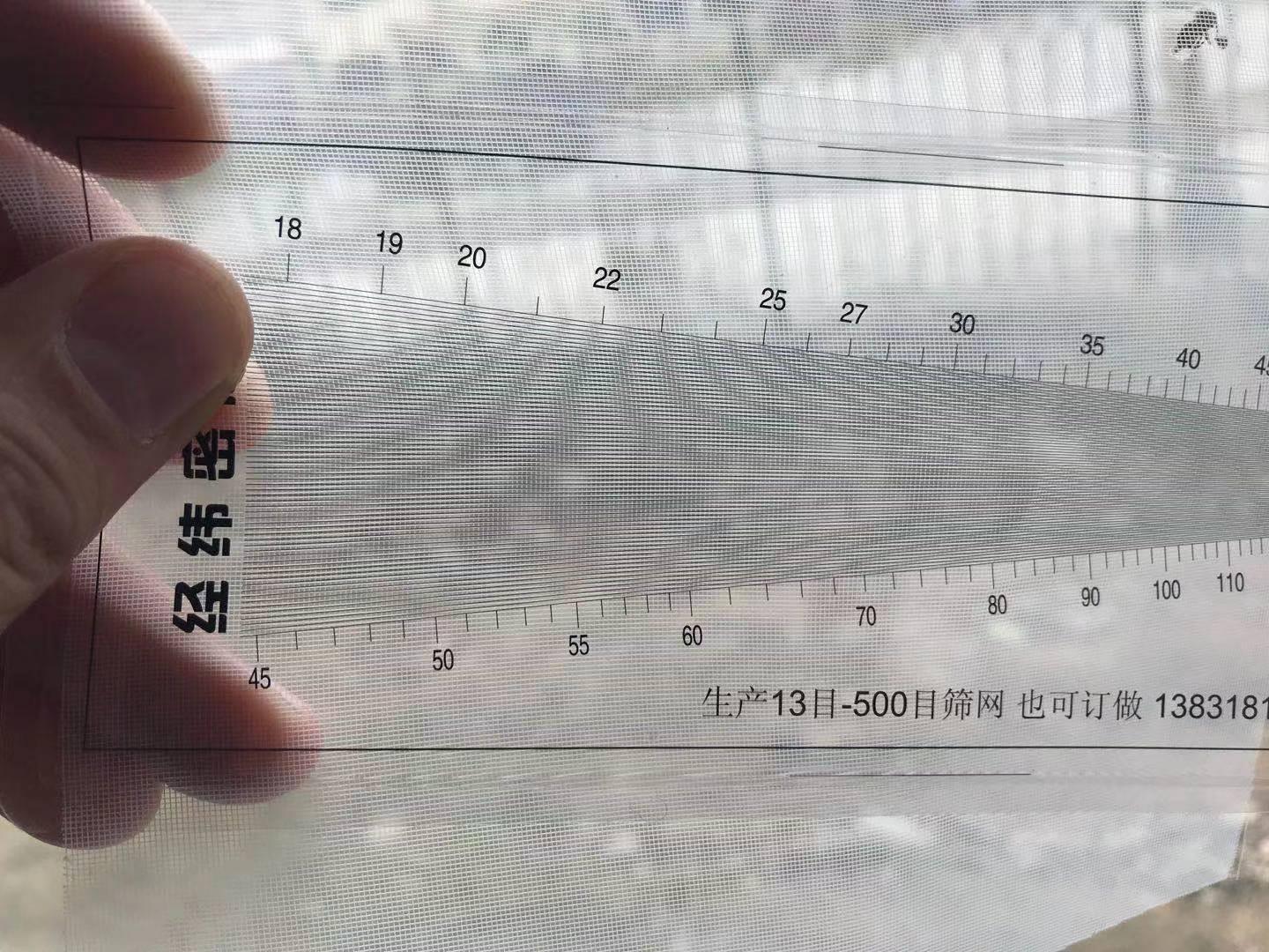测量时将纺织面料放在光线好的地方,需要测量的丝网放在平整的台面上,然后把密度镜放在织物的上面,慢慢移动密度镜,使密度镜平行于织物的纬线和经线,使之线条产生重叠,此时会在密度镜上产生菱形的花纹,花纹对角所指向的密度镜上对应的数字就是该织物的目数(每厘米或者每英寸的密度)。