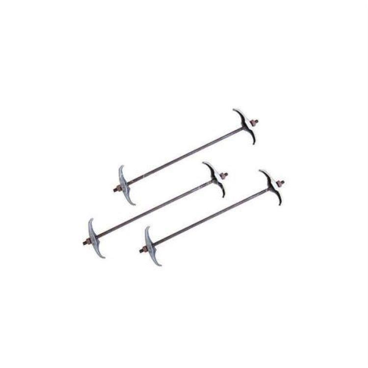 止水螺杆,由一根中间螺杆连接两根对称的端螺杆组成,中间螺杆设有止水片和两处止动,端螺杆设有紧固螺纹并配置紧固螺母。中间螺杆的两头设有连接外螺纹,端螺杆的一头设有连接内螺纹与中间螺杆的连接外螺纹相配。中间螺杆与端螺杆的连接处套有管形垫块,垫块中心部位是护圈,管形垫块的一端面沿圆周排列一圈轴向立柱,各立柱间留有间隙。垫块端面设有省料孔。由中间螺杆与端螺杆分段组合成的止水螺杆,和普通止水螺杆一样用于搭建混凝土浇筑模,并不需要改变现有的施工工艺过程,很容易推广应用。在混凝土浇注完成、拆除模板后可以将端螺杆从埋入墙体内的中间螺杆上取下回收,回收的端螺杆和新的中间螺杆配合又可重复使用。