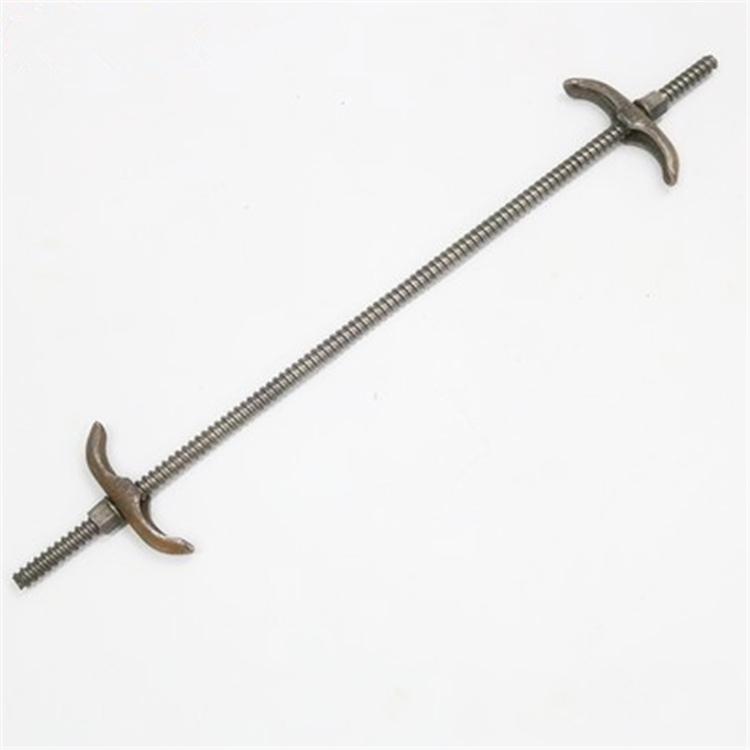 止水螺杆,由一根中间螺杆连接两根对称的端螺杆组成,中间螺杆设有止水片和两处止动,端螺杆设有紧固螺纹并配置紧固螺母。中间螺杆的两头设有连接外螺纹,端螺杆的一头设有连接内螺纹与中间螺杆的连接外螺纹相配。中间螺杆与端螺杆的连接处套有管形垫块,垫块中心部位是护圈,管形垫块的一端面沿圆周排列一圈轴向立柱,各立柱间留有间隙。垫块端面设有省料孔。由中间螺杆与端螺杆分段组合成的止水螺杆,和普通止水螺杆一样用于搭建混凝土浇筑模,并不需要改变现有的施工工艺过程,很容易推广应用。在混凝土浇注完成、拆除模板后可以将端螺杆从埋入墙体内的中间螺杆上取下回收,回收的端螺杆和新的中间螺杆配合又可重复使用。