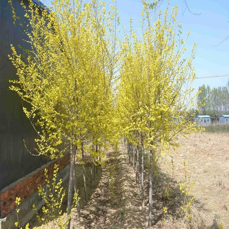 落叶乔木,高25米,树冠圆球形。树皮暗灰色,纵裂,粗糙。小枝金黄色,细长,排成二列状。叶卵状长椭圆形,金黄色,长2-6厘米,先端尖,基部稍歪,边缘有不规则单锯齿。早春先叶开花,簇生于上一年生枝上。