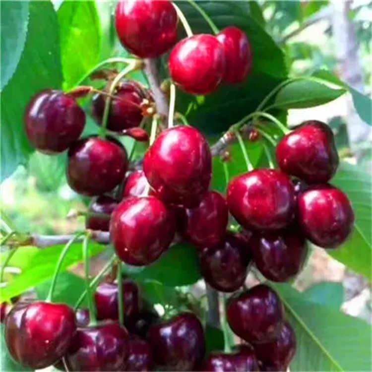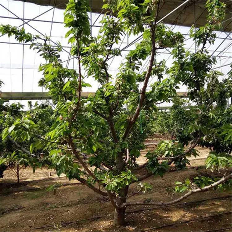 新品大樱桃苗木,早成花,早结果,树势中庸,树姿开张,大枝伸展角度较大,枝条多斜生,下垂,松散,幼树枝条封顶早,枝条充实,为早花早果创造了基础条件(比美早,红灯,萨米脱早)。