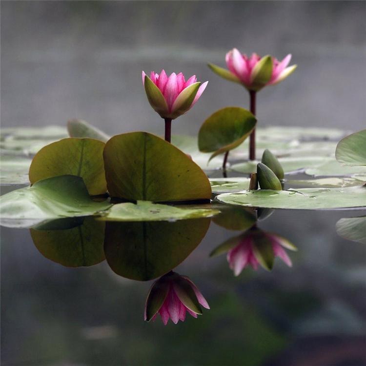 睡莲(学名:Nymphaea tetragona):睡莲是多年生浮叶型水生草本植物,根状茎肥厚,直立或匍匐。叶二型,浮水叶浮生于水面,圆形、椭圆形或卵形,先端钝圆,基部深裂成马蹄形或心脏形,叶缘波状全缘或有齿;沉水叶薄膜质,柔弱。花单生,花有大小与颜色之分,浮水或挺水开花;萼片4 枚,花瓣、雄蕊多。果实为浆果绵质,在水中成熟,不规律开裂;种子坚硬深绿或黑褐色为胶质包裹,有假种皮。品种不同其形态特征不同。
