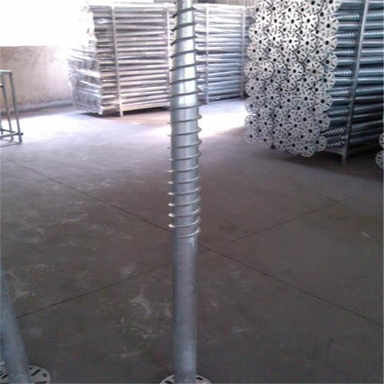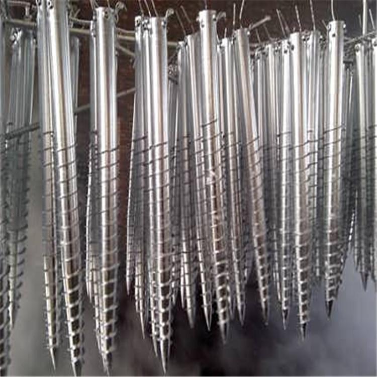 螺旋地桩:螺旋地桩即为钢管缩尖后加焊上螺旋叶片,以增大地桩的承载力及拉拔力,螺旋地桩的旋片有单螺旋、双螺旋和多旋片,可根据地形,地势需要进行选择。螺旋地桩施工简单方便,不受气候天气影响,打桩过程中不排土,不污染环境,不破坏环境,性能好,寿命长,可反复使用,节约成本和工时,而且螺纹挤压桩侧土加大桩周围土的密实度,增大阻力和承载力。广泛应用于沙漠、平地、水塘等。