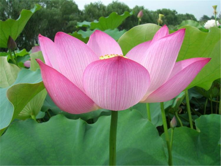 荷花种类很多,分观赏和食用两大类。原产亚洲热带和温带地区,中国早在周朝就有栽培记载。荷花全身皆宝,藕和莲子能食用,莲子、根茎、藕节、荷叶、花及种子的胚芽等都可入药。其出污泥而不染之品格恒为世人称颂。“接天莲叶无穷碧,映日荷花别样红”就是对荷花之美的真实写照。荷花“中通外直,不蔓不枝,出淤泥而不染,濯清涟而不妖”的高尚品格,历来为诗人墨客歌咏绘画的题材之一。