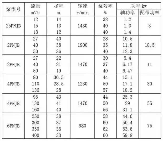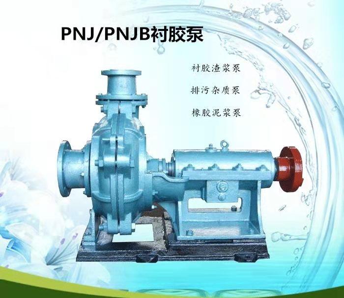 PNJ、PNJF型泵系单级单吸离心式衬胶泵,可输送各类不含有尖角的固体颗粒的矿浆。输送矿浆最大浓度不超过65%(重量计),温度不得超过60℃。两种泵结构型式相同,但材质不同,PNJF型泵专用于输送有腐蚀性矿浆。材质:根据用途不同,PNJ、PNJF型泵的泵轴分别用优质碳素钢、镍铬钢制成,护套分别为耐磨橡胶、耐磨耐酸橡胶与钢板合制而成,叶轮为铸钢制骨架(25PN、25PNJF型泵为铸铁制骨架)分别外衬耐磨橡胶、耐磨耐酸、橡胶制成。密封形式:PNJ、PNJF型泵有填料和付叶轮两种不同的密封结构(25PNJ、25PNJF型泵只有付叶轮密封结构)。密封结构一般按填料密封供货。若选用付叶轮密封,订货时必须说明。泵用付叶轮密封时,进口灌注高度不超过5米水柱(25PNJ、25PNJF型泵不超过1.5米水柱)。2PNJB、2PNJFB的排出口可按45°间隔旋转不同方向。4PNJFB的排出口在270°范围内可按45°间隔旋转不同方向。6PNJB、6PNJFB的排出口在270°范围内可按30°间隔旋转不同方向。25PNJ、25PNJF的排出口可按90°间隔旋转不同方向,在没有特殊说明的情况下,供货一律为垂直向上出口。泵的旋转方向,从传动方向看为逆时针旋转。