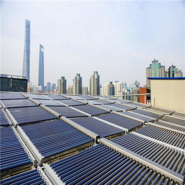 屋面集中安装太阳能集热器,设置满足用户每日需求量的储热保温水箱,控制系统、循环装置与其他辅助设备放置在设备间或楼顶,太阳能集热器吸收太阳光的能量温度升高,智能控制系统控制循环泵启动或停止,分梯度将储热水箱和恒温水箱中的水逐级加热,保证恒温水箱中的热水温度恒定,打开用水点即出热水,太阳能系统与常规能源