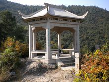 以石建凉亭,在我国也相当普遍,现行最早的凉亭,就是石亭。早期的石亭大多模仿木结构的做法,斗拱、月梁、明、雀替、角梁等等,皆以石材雕琢而成。如唐初建造的湖北黄梅破额山上的鲁班凉亭,就是全部以石材仿造木结构的斗拱梁架而建造的。户山秀峰前的两座分别建于宋代和元代的石亭也是如此。明清以后,石亭逐渐摆脱了仿木结构的形式,石材的特性突出了,构造方法也相应地简化,造型质朴、厚重,出檐平短,细部简单。有些石亭,甚至简单到只用四根石柱顶起一个石质的凉亭盖。这种石块砌筑的凉亭,简洁古朴,表现了一种坚实、粗犷的风貌。然而,有些石凉亭,为了追求错彩镂金、精细华丽的效果,仍然以石仿木雕刻斗拱、挂落,屋顶用石板做成歇山、方攒尖和六角攒尖等等。
