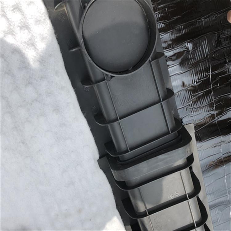 5、二次防水功能,排水卷材铺设完毕由于采用粘接或烫接形式,从而形成一个新的防水层,即有排水功能又有二次防水功能。