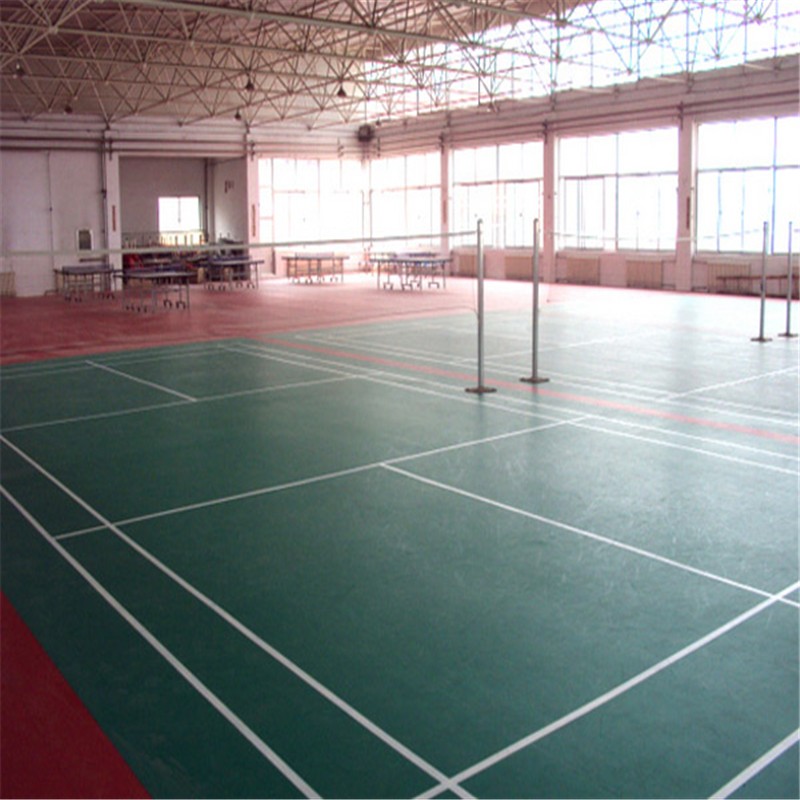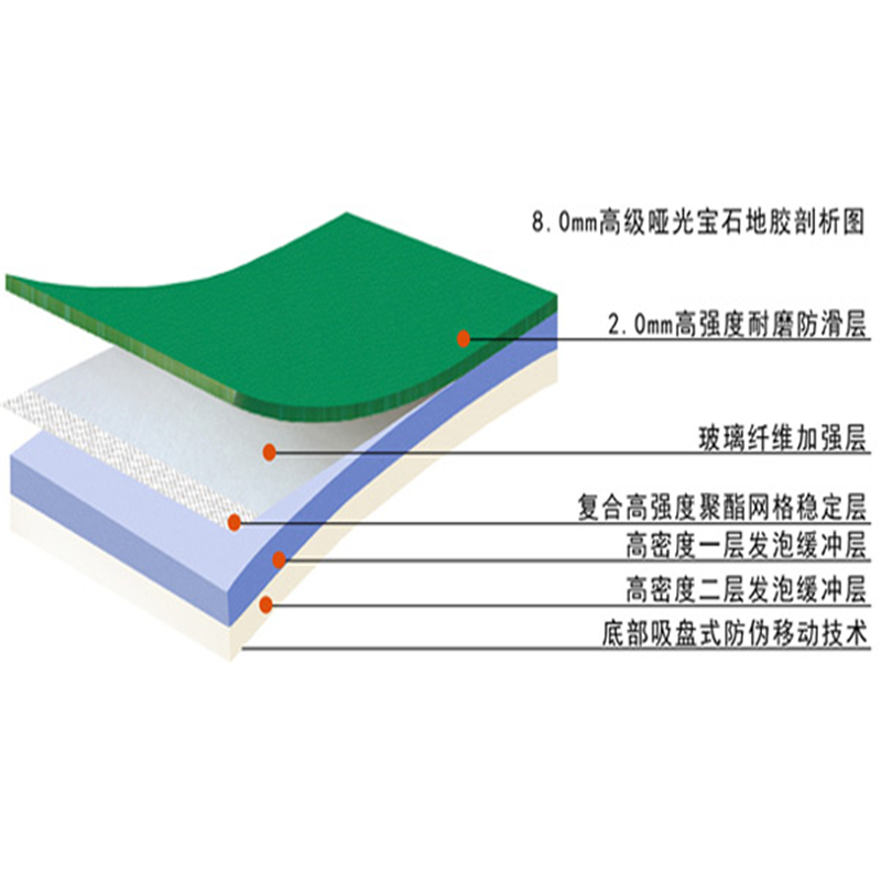 . 运动地板由TPU处理的表层、PVC耐磨层、1000D的玻璃纤维补强网和特殊网格布纤维加强层和PVC发泡缓冲层组成。