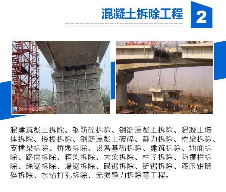 石家庄曙业建筑按工程公司专业承接各类钢筋混凝土结构建筑物改造拆除,混凝土切割拆除、钢筋混凝土切割拆除、静力切割拆除、静力拆除、基础切割拆除、建筑切割拆除、建筑物切割拆除、墙体切割拆除、楼板切割拆除、地面切割拆除、路面切割拆除、桥梁切割拆除、箱梁切割拆除、柱子切割拆除、承重墙切割拆除、防撞墙切割拆除、防撞栏切割拆除、绳锯切割、碟钜切割、碟锯切割、链锯切割、墙体开门洞、楼板开门洞。 石家庄曙业建筑工程公司专业承接工程打孔包括:承重墙打孔钻孔、钢筋混凝土打孔钻孔、混泥土打孔钻孔、楼板打孔钻孔、墙体打孔钻孔, 水钻打孔钻孔、工程打孔、工程钻孔等以及其它混凝土建筑结构打孔钻孔工程以及切割拆除工程,我公司承诺不拘工程大小,只要您来电我们都会第一时间到达施工现场,业内最专业。 我公司拥有经验丰富的施工队伍和专业的混凝土切割机设备:墙锯切割设备、绳锯切割设备(又名液压墙锯、液压墙锯机、墙体切割机,大型墙锯,线锯,金刚石绳锯、钻石绳锯)墙体切割拆除设备等.. 专业加固改造工程包括: 钢结构施工,植筋及裂缝修补,室外观光电梯,别墅结构改造,静力拆除、破碎,砖混结构改造,公用建筑结构改造,钢楼梯、螺旋楼梯制作 ,楼板开洞及梁加固,粘钢加固,粘碳纤维加固,屋顶加层。 本公司采用目前最先进的钢筋混凝土切割结构分离和水钻排孔技术。真正实现对不同规格和形状的桥梁、道路、烟囱、建筑立柱、钢筋砼墙体、砖混结构墙体、建筑大梁等建筑物、构筑物实施无损切割(传统的建筑改造或局部拆除分离钢筋混凝土结构不但无法实现整齐分离截面,而且对后续的加固施工造成一定的困难)。利用墙锯绳锯等专业切割设备,可真正实现整齐分离,无损切割。是建筑桥梁拆除工程的最佳选择。 我公司是一家专业做钢筋混凝土切割工程。多次承接全国各大中小型拆除拆迁切割等施工项目。公司师资队伍强大, 技术经验丰富,拆迁拆除切割等设备完善。