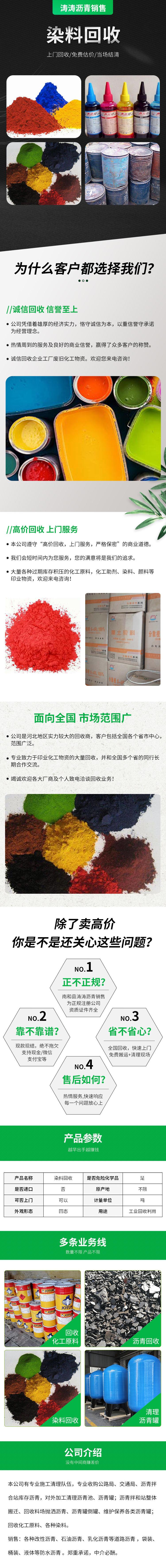 沥青、染料、油墨、颜料、化工助剂销售、回收(以上不含危险化学品)、机械设备清洗、维护、管道疏通、容器 ...| 品牌 | 涛涛 | 产品名称 | 染料回收 |