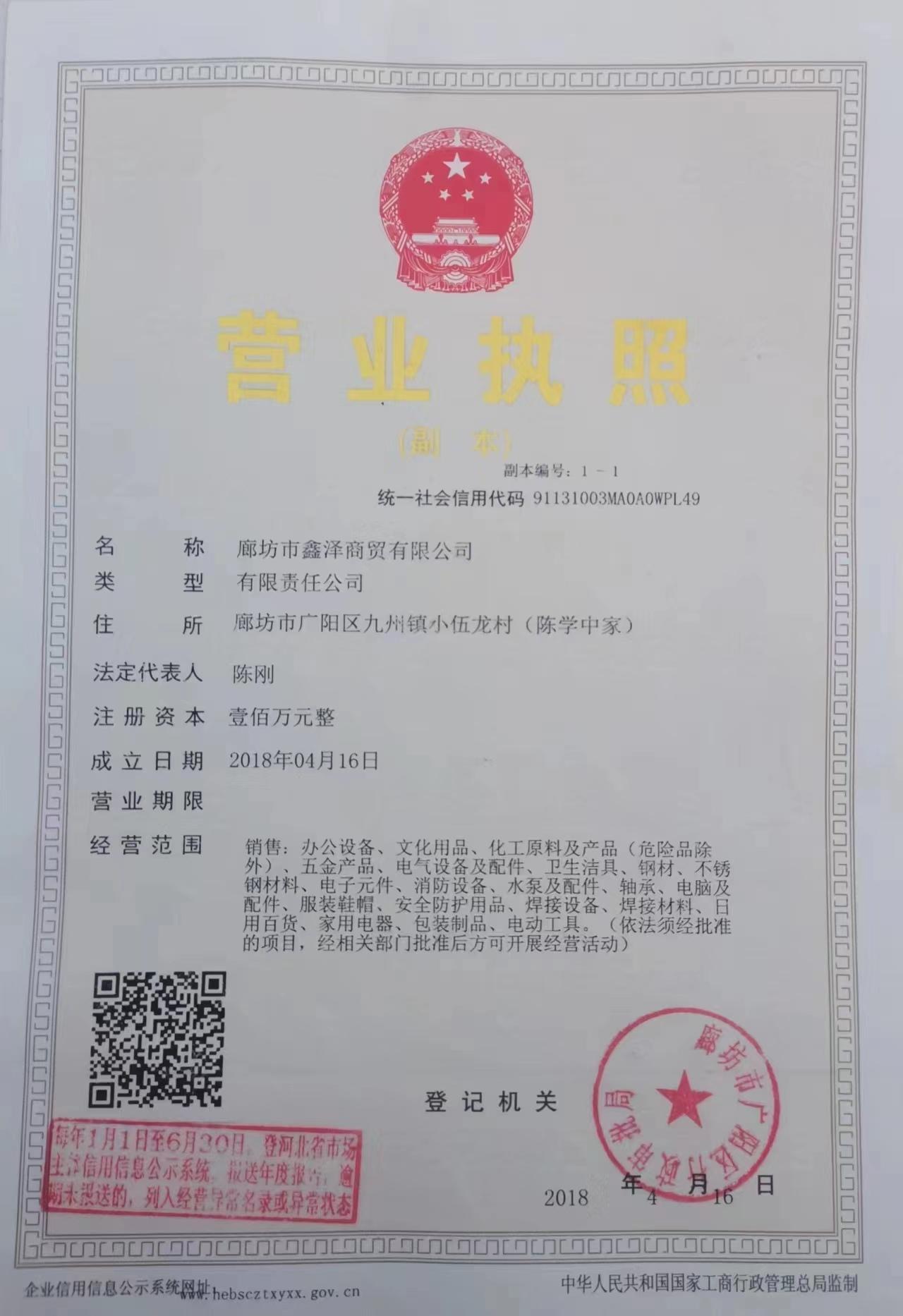 廊坊市鑫泽商贸有限公司成立于2018-04-16,法定代表人为陈刚,注册资本为100万元人民币,统一社会信用代码为91131003MA0A0WPL49,企业地址位于廊坊市广阳区九州镇小伍龙村(陈学中家),所属行业为批发业,经营范围包含:销售:办公设备、文化用品、化工原料及产品(危险品除外)、五金产品、电气设备及配件、卫生洁具、钢材、不锈钢材料、电子元件、消防设备、水泵及配件、轴承、电脑及配件、服装鞋帽、安全防护用品、焊接设备、焊接材料、日用百货、家用电器、包装制品、电动工具。(依法须经批准的项目,经相关部门批准后方可开展经营活动)。廊坊市鑫泽商贸有限公司目前的经营状态为存续(在营、开业、在册) ...