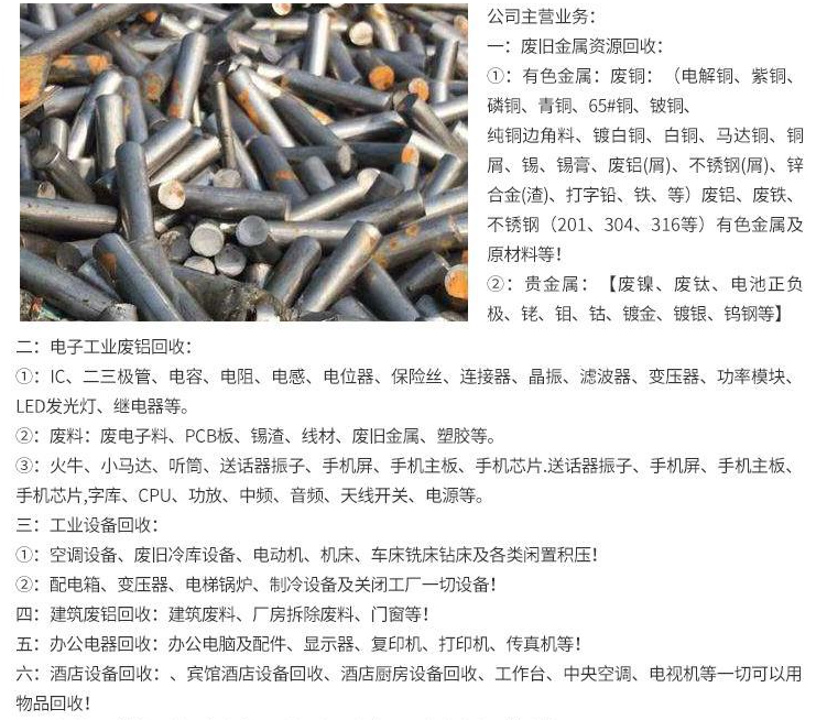 主营:建筑物拆除工程;生产性、非生产性废旧物品回收、销售;销售:电线电缆、仪表仪器、变压器、塑料制品(医用