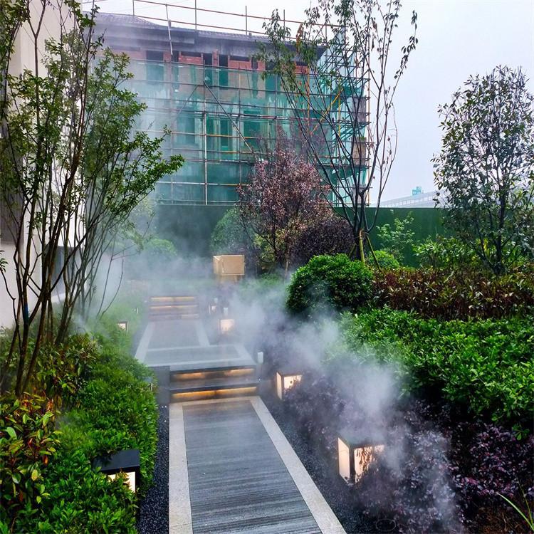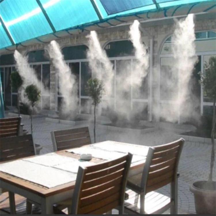 雾化喷头部分:常用的喷头有两种离心式喷头和红宝石撞针喷头。离心式喷嘴一般用于室内外自动浇花、爬虫类变色龙乌龟等保湿降温、鸡场猪场降温消毒、温室育苗加湿降温等。需要压力4-15公斤,可使用PE管外径7-10mm内径3.5mm, 采用4号或5号喷嘴孔径0.4-0.5mm,孔径比一般塑料浇花喷嘴小一倍以上,耐磨性强20倍以上,雾点更细更轻。高压红宝石撞针式喷嘴一般用于景点广场、房产社区、舞台剧情等。需要压力40-70公斤(kg)=4-7Mpa,使用铜管或不锈钢管外径7-10mm内径5-9mm,采用0.15mm\0.2mm\0.3mm喷嘴孔径,孔径越小雾的颗粒度越细效果越好。
