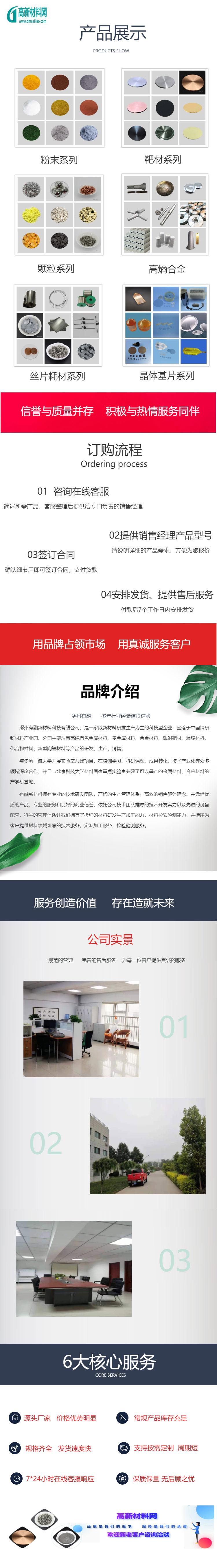 主营:公司专注于高纯金属材料、真空镀膜材料、蒸发材料、氧化物、新型陶瓷等高端前沿新材料的研发和生产。专业生
