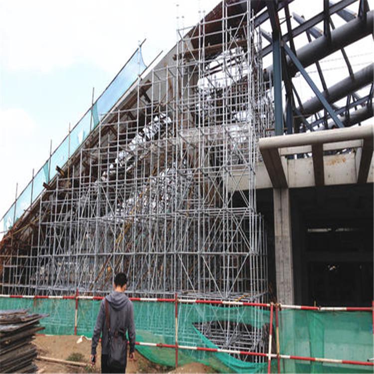 承插型盘扣式钢管支架:立杆采用套管承插连接,水平杆和斜杆采用杆端扣接头卡入连接盘,采用楔形插销连接,形成结构几何不变体系的钢管支架。