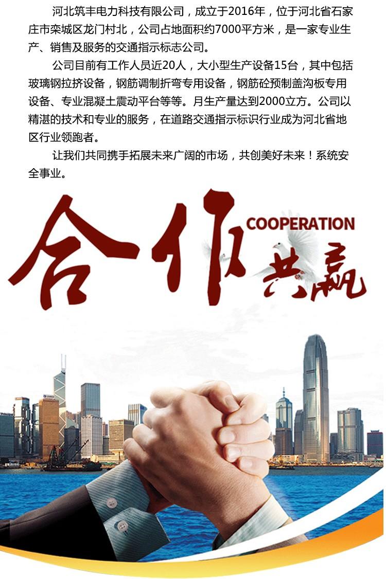 河北筑丰电力科技有限公司,成立于2016年,位于河北省石家庄市栾城区龙门村北,公司占地面积约7000平方米,是一家专业生产、销售及服务的交通指示标志公司。 公司目前有工作人员近20人,大小型生产设备15台,其中包括玻璃钢拉挤设备,钢筋调制折弯专用设备,钢筋砼预制盖沟板专用设备、专业混凝土震动平台等等。月生产量达到2000立方。公司以精湛的技术和专业的服务,在道路交通指示标识行业成为河北省地区行业者。