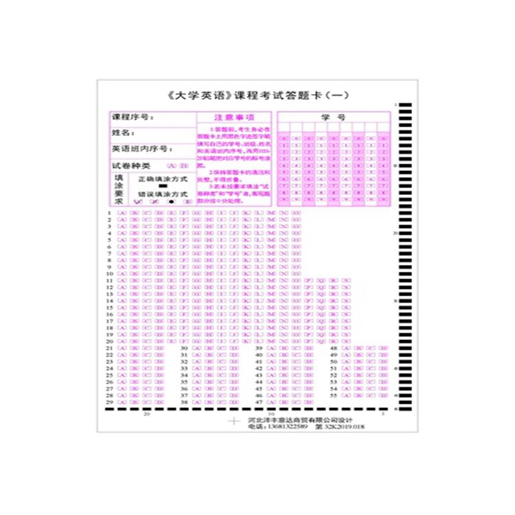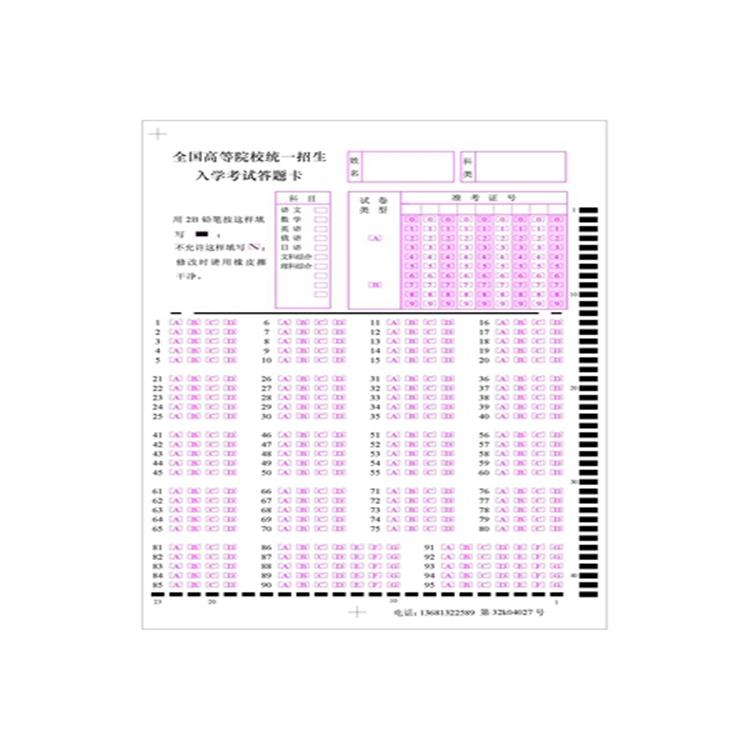 机读卡 信息卡是光电阅读卡片,它是用光学标记阅读机(简称OMR)来连续阅读的。OMR对信息卡上的所有被阅读部分的定位精度要求较高,所以印刷一张信息卡有很多要求: