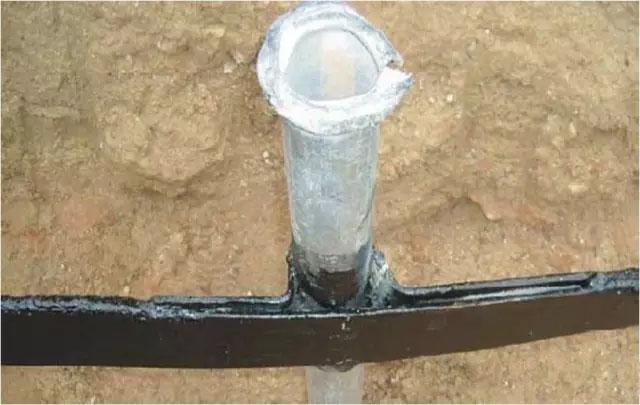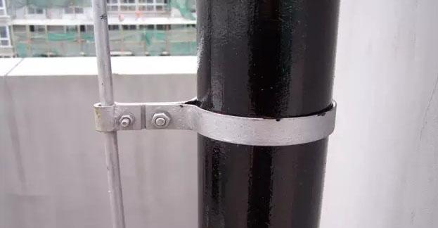 突出屋面的铸铁金属管道做防雷接闪器时,用管道吊件和避雷安装附件相连。