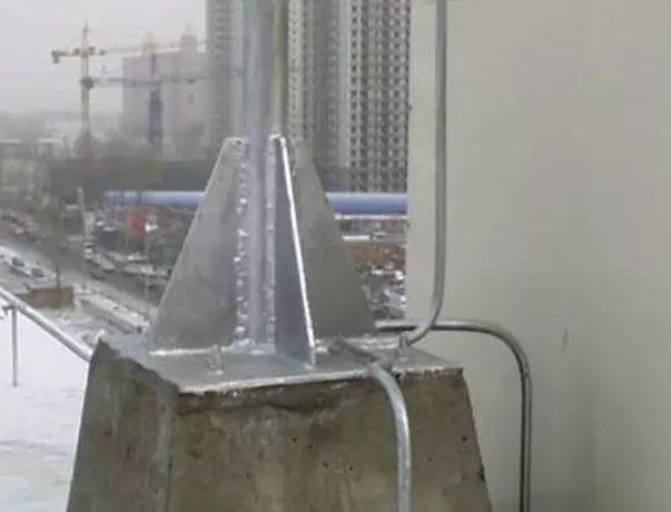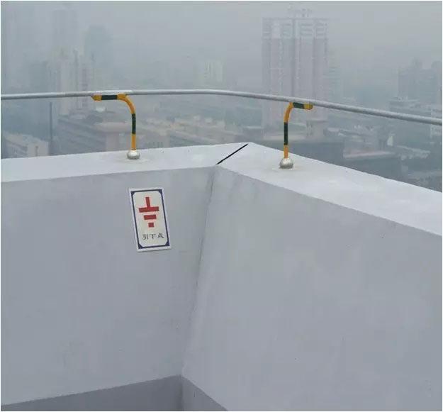 建筑物屋顶上有突出物,如金属旗杆、透气管、金属天沟、铁栏杆、爬梯、冷却水塔、电视天线等,这些部位的金属导体都必须与避雷网焊接成一体。
