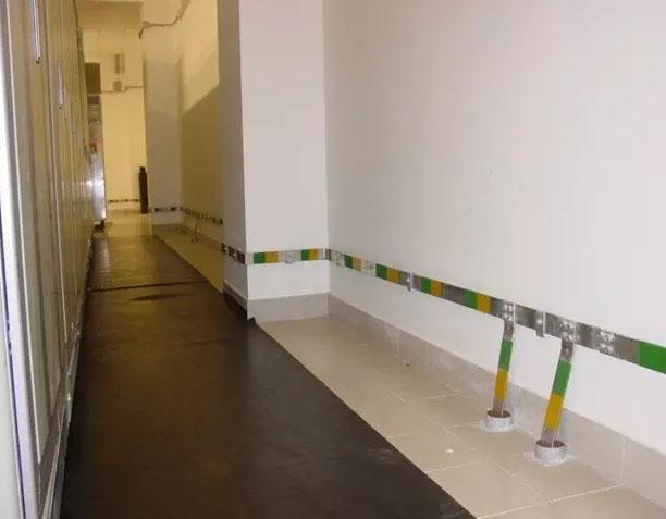 变配电室明敷接地干线安装:当沿建筑物墙壁水平敷设时,距地面高度250~300mm,且高度均匀一致;与建筑物墙壁间距10~15mm,且间距均匀一致。