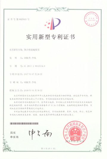 唐山绿源环保科技有限公司李见获得实用新型专利证书--络合铁脱硫装置