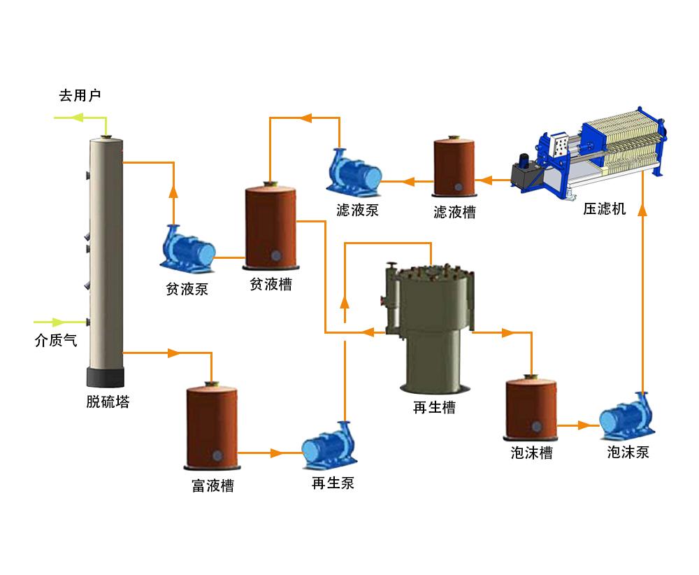 再生槽上部分离出的硫泡沫流入泡沫槽、经泡沫泵送入压滤机,从而得到纯度较高的单质硫。其中产生的清液经降温、活化、沉淀后返回溶液系统。