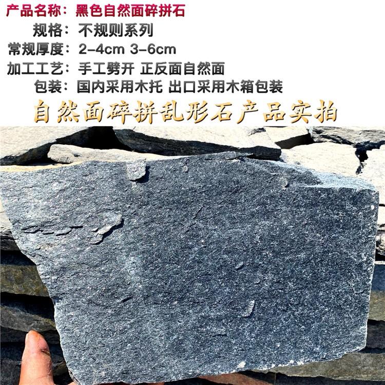 黑色石英岩黑石英碎拼石是一种不规则乱形片石.颜色以墨黑色为主.手工分劈厚度3-5公分.板面直径大于15cm以上.主要用于景观墙 文化墙 挡土墙 花坛墙面 公园景观墙等墙面粘贴.也可以用人工湖湖底摆放产品有净化水质特点.产品属于冷色调岩石粘贴墙面庄重而复古.国内客户发货采用木托打包一件约重2.5吨左右.叉车卸货.国外客户发货采用免熏蒸木箱一箱约重1吨左右.送往天津港出货.产品原料开采于内丘县西部山区章么境内.本产品品质坚硬 耐风化 不褪色等特点.