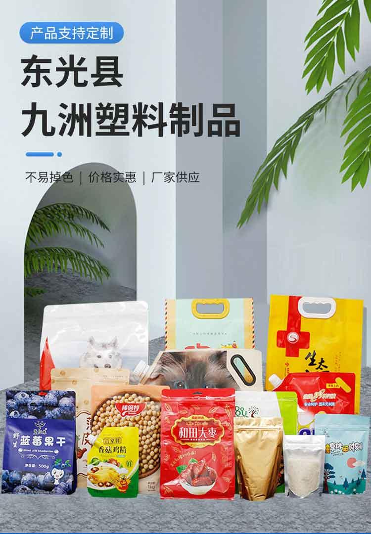 东光九洲塑料制品有限公司是一家集研发、生产、销售于一体的软包装生产企业,本厂可定制各种塑料包装袋,抽真空袋,冷冻袋,干果袋,东北特产包装袋,铝箔袋,挂面袋,大米袋,狗粮猫粮袋,调料袋,红枣袋,花生瓜子袋,饲料袋,农药袋,阴阳袋,猫砂袋,杂粮袋,花椒大料袋,牛皮纸开窗袋 食品包装袋,八边封袋,自立拉链袋,吸嘴袋,各种材质包装卷膜,免费设计版面,量大从优,各种现货48小时及时发货,详情请咨询客服。