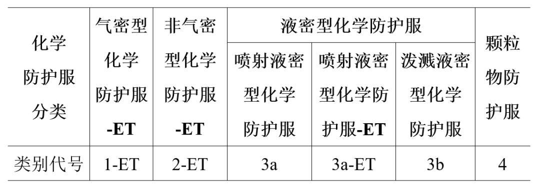②非气密型化学防护服-ET:——应急救援工作中作业人员所需要的,带有头罩、视窗、手足部防护的,为穿着者提供对液态和固态有毒有害化学物质防护的单件化学防护服类型