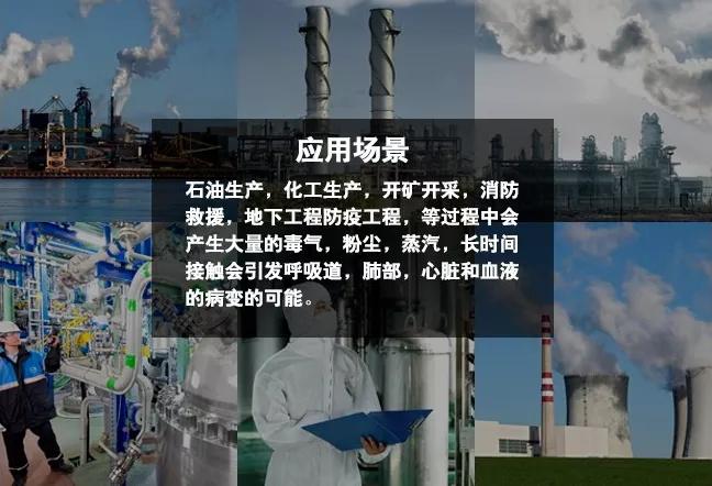 应用场景广泛,如石油生产,化工生产,消防救援,开矿开采等。适用于多种有尘作业场所,用以防御吸入各类颗粒物(粉尘、烟、雾等)及不超标异味气味,工作人员佩戴该长管面具可以安全有效地进行抢险、救灾、事故处理及工业性作业。